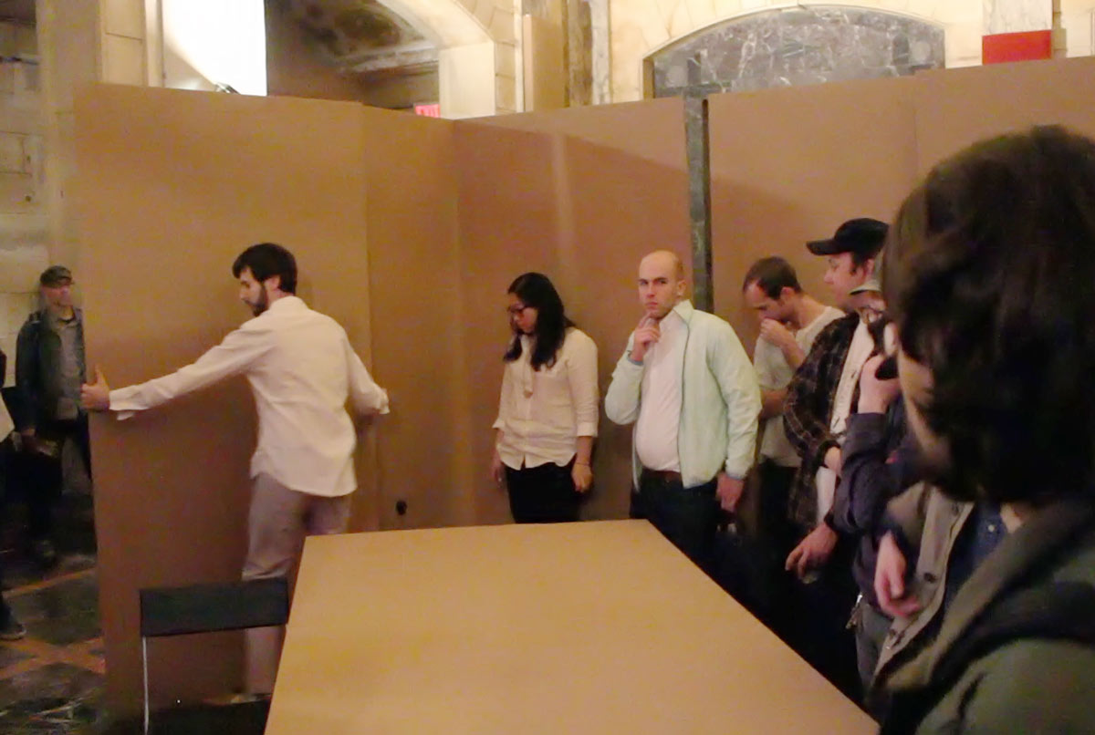 In the performance, numerous gestures are enacted in relation to power in the theatrical space. A stage curtain, an object of division, is brought down to become a rug. Walls become tables, with the piece ending with members of the audience literally around the table.