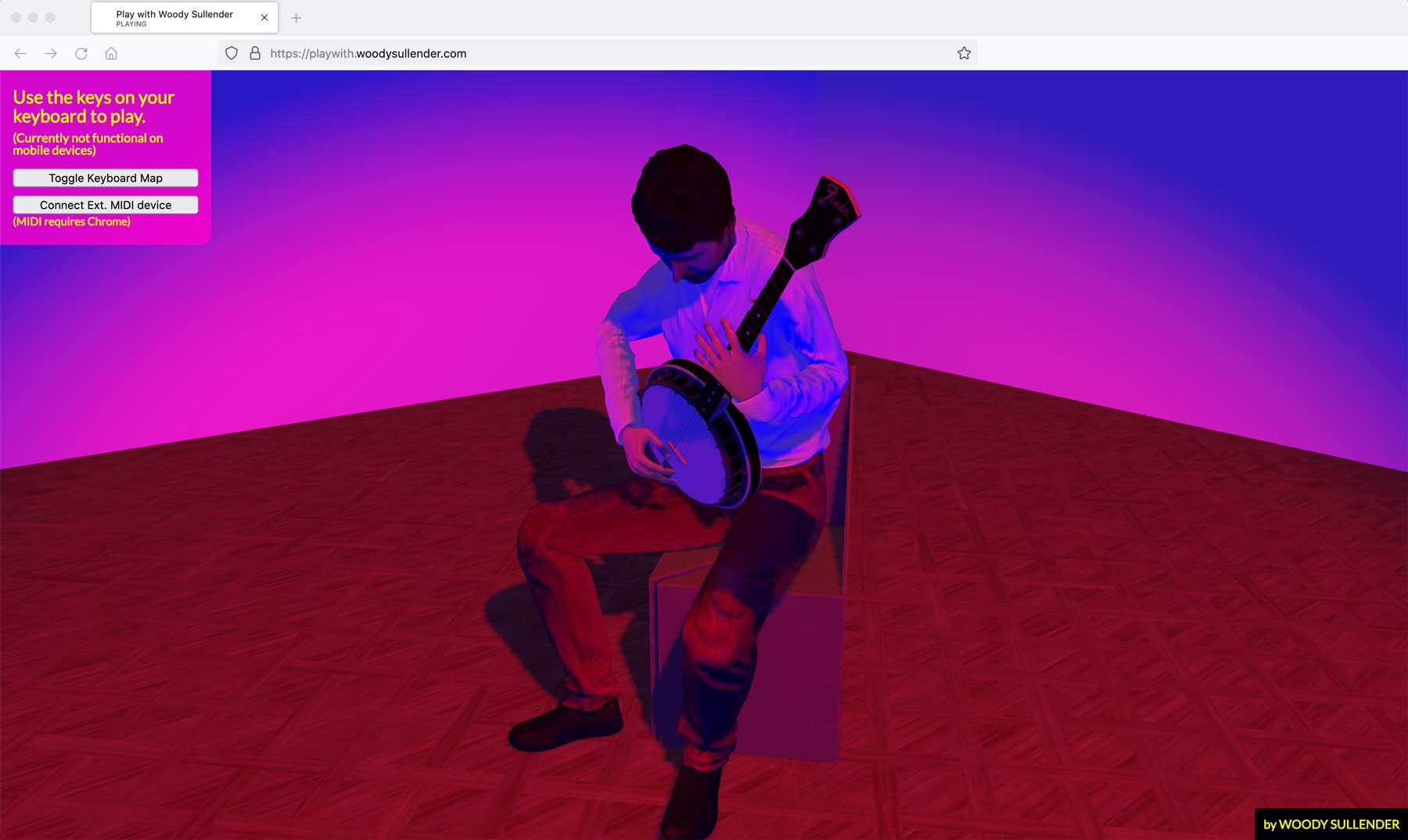 Through the site, the visitor can control this instrumentalist avatar as a unique banjo performer. By using a MIDI keyboard, the viewer can have more nuanced control for a more musical experience.